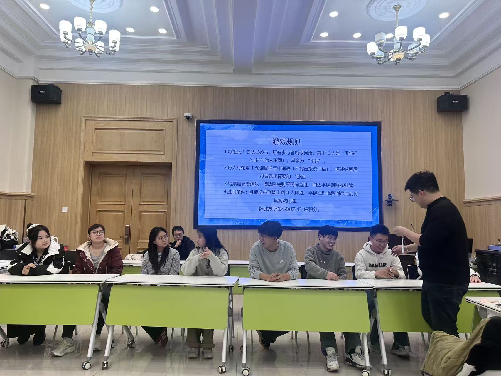 “谁是卧底·分组对抗”环节考验着同学们的语言表达能力和逻辑推理能力。同学们绞尽脑汁设计措辞,有人巧妙利用专业知识作掩护,有人则采用反向思维迷惑对手。投票环节更是紧张刺激,当真正的卧底身份揭晓时,全场都沉浸在推理成功的喜悦或恍然大悟的惊讶中。