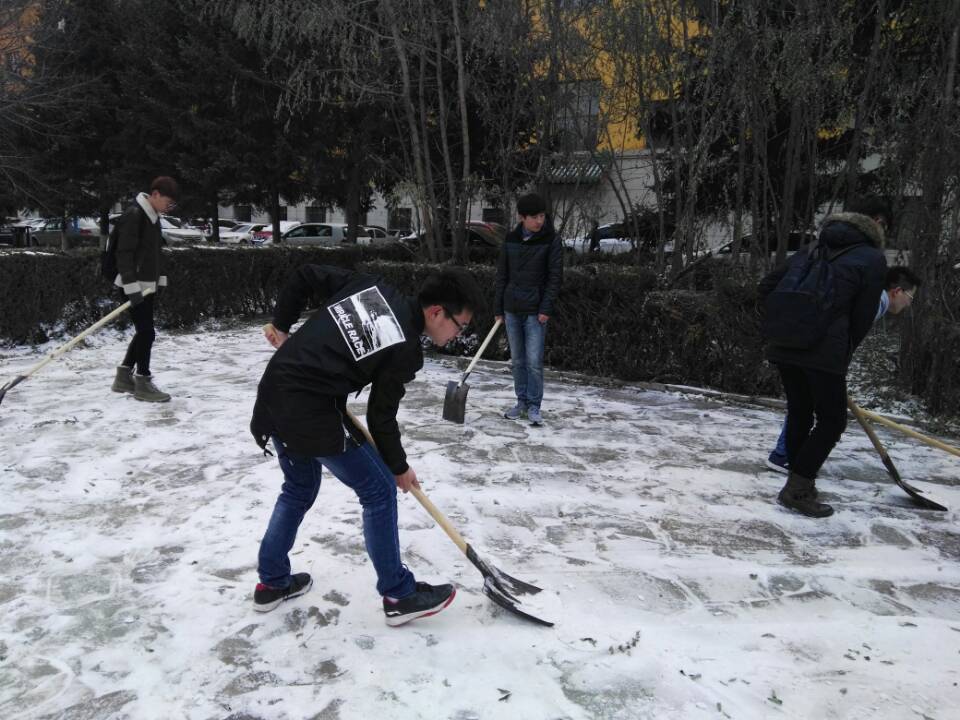 青年大学生在分团委学生会主席陈健同学的带领下在吉林大学朝阳校区再次开展义务清雪活动。