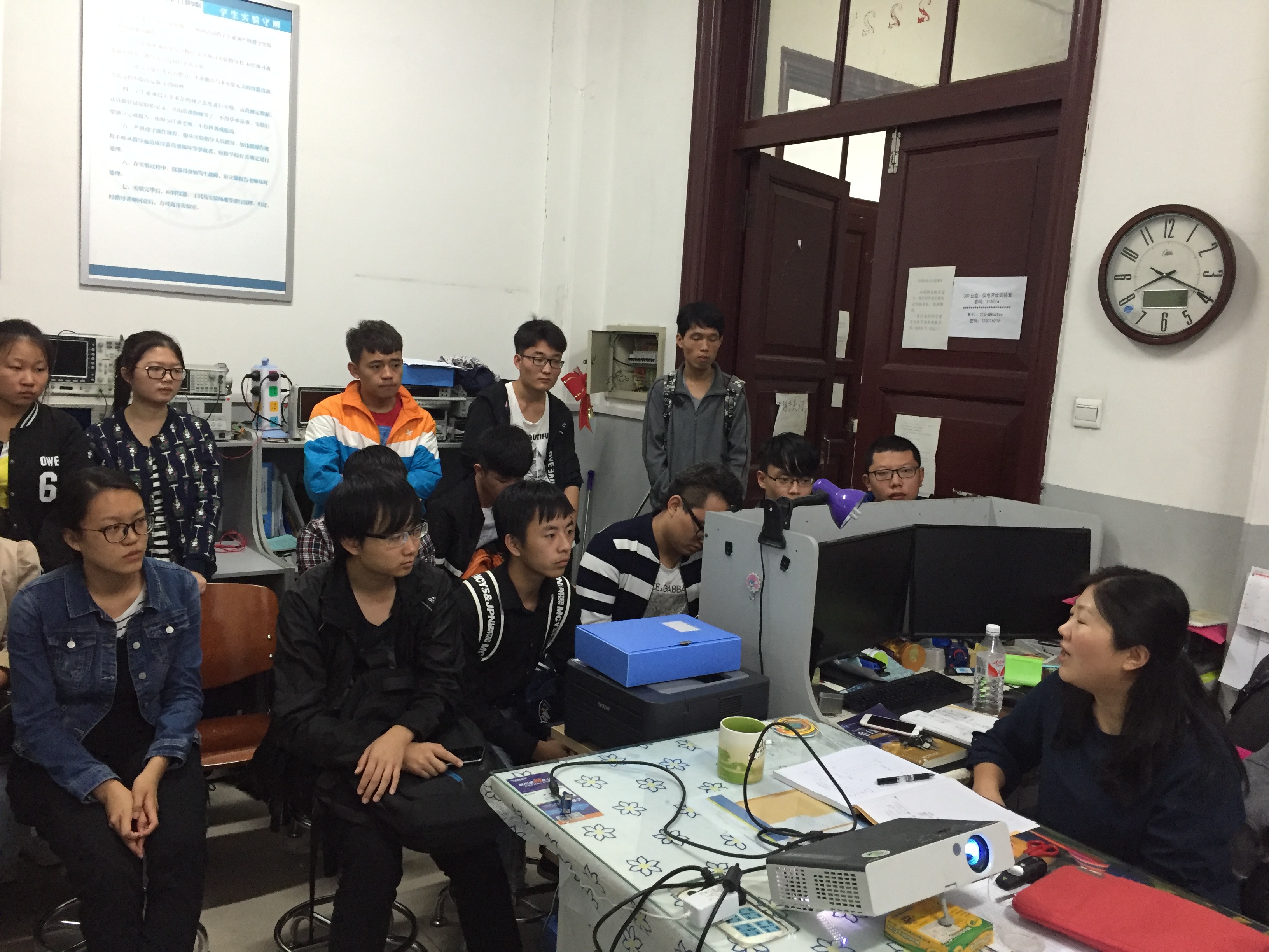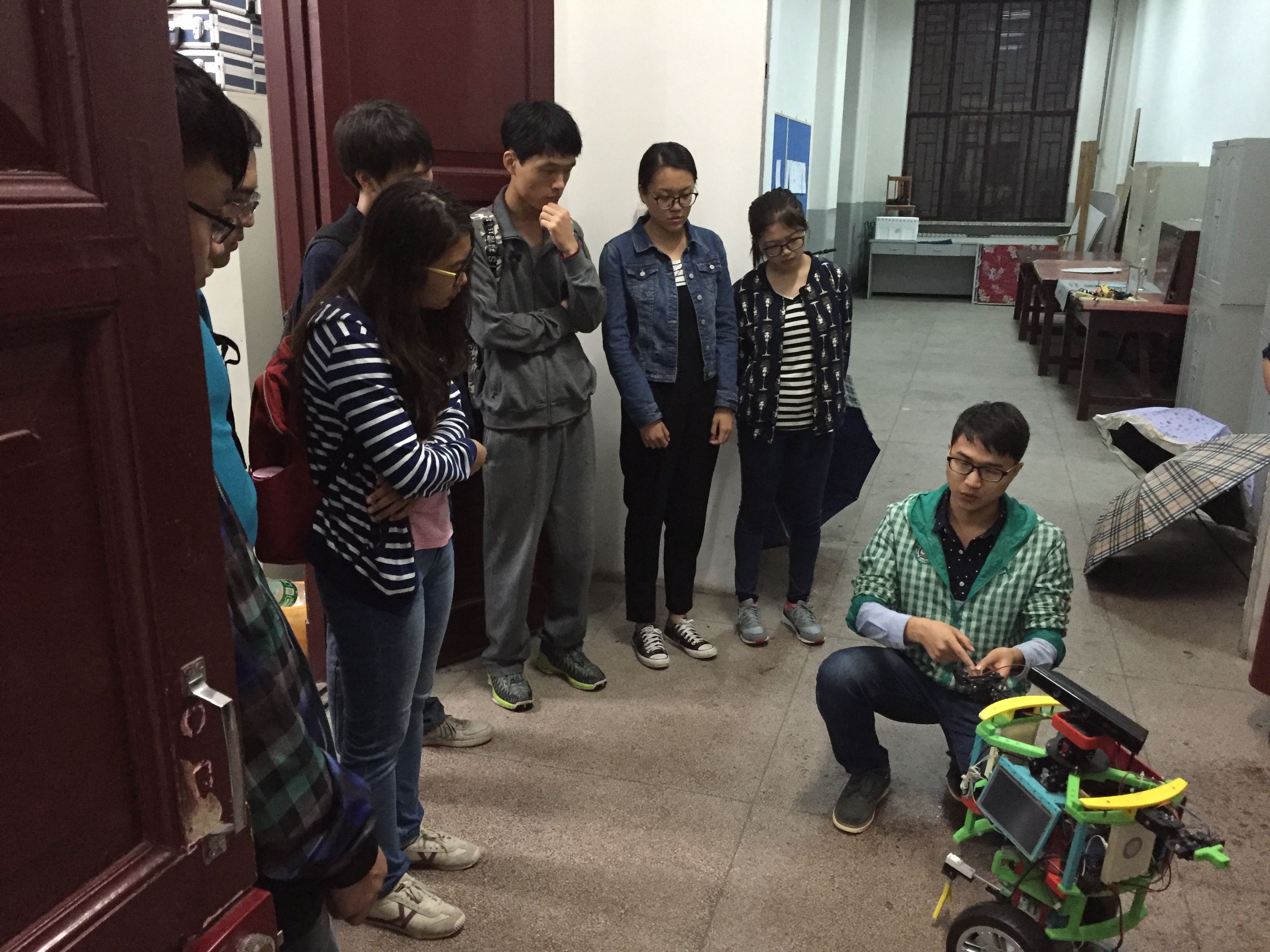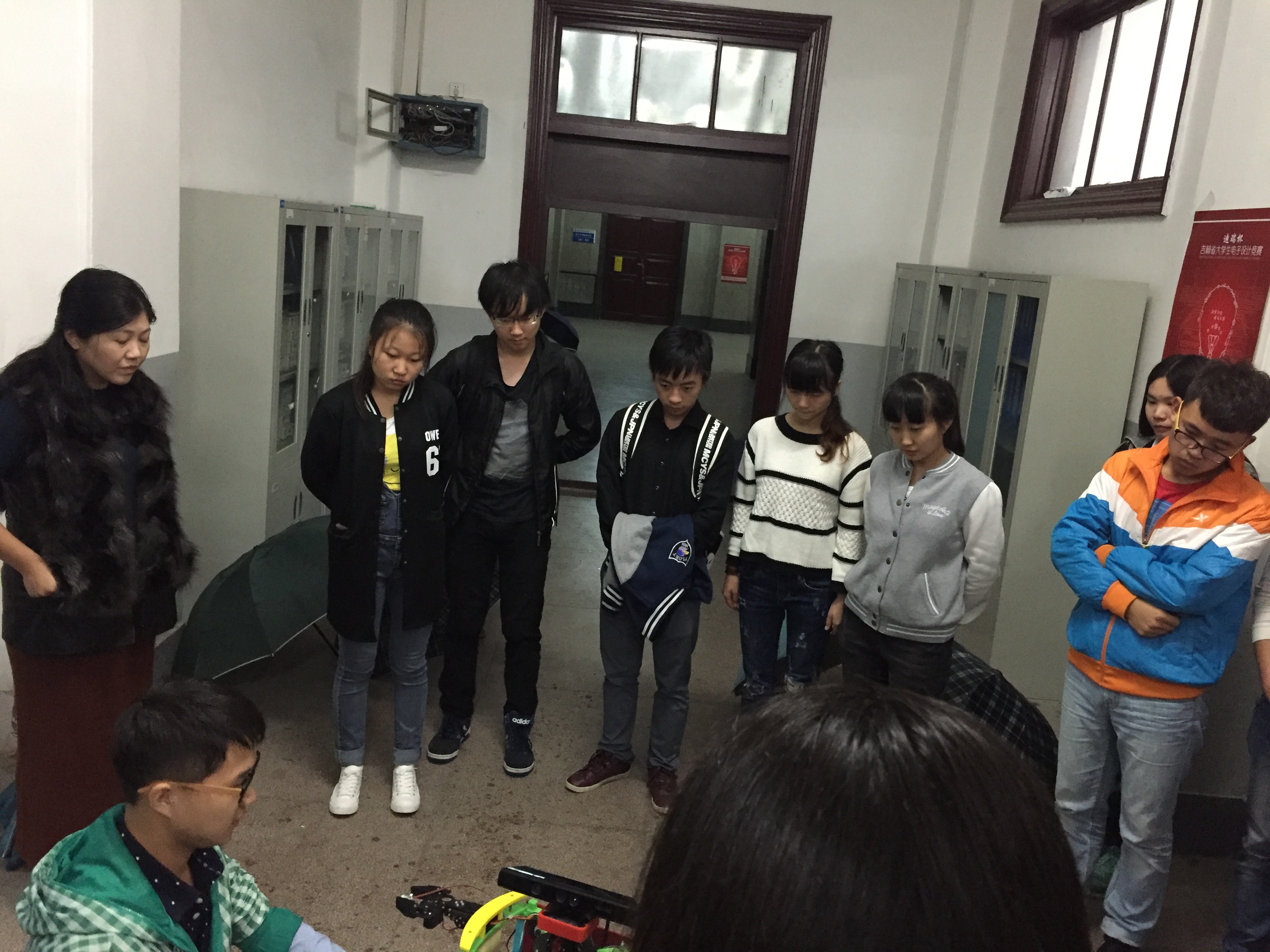 首先,千老师向参加讲座的学生展示了216+开放实验室机器人项目的进展情况,明确地指出参加各个项目学生需要承担的任务。之后,千老师简要地介绍了三个项目,并邀请项目负责人做深入的介绍。第一个为大家做介绍的是“小六”机器人项目负责人周葛。在众多学生的注目下,项目负责人周葛打开机器人电源,从下而上,从简单的平衡到嵌入式系统,他深入浅出地为大家介绍了机器人“小六”的各项功能。之后登场的是智能机械臂,项目负责人姜耀细心地为大家讲解了信号采集部分传感器的选取以及信号处理中所遇到问题的解决方法,并为该项目的进一步发展提供了自己的看法和实质性的建议。最后讲解的是魔方机器人项目负责人穆怀志。项目负责人穆怀志从解魔方的原理、图像信息获取、机械结构搭建等几个方面进行介绍,由简至易地讲解了魔方机器人的各个部分。整个介绍过程,千老师一直专注地听着,不时投来赞赏的目光。