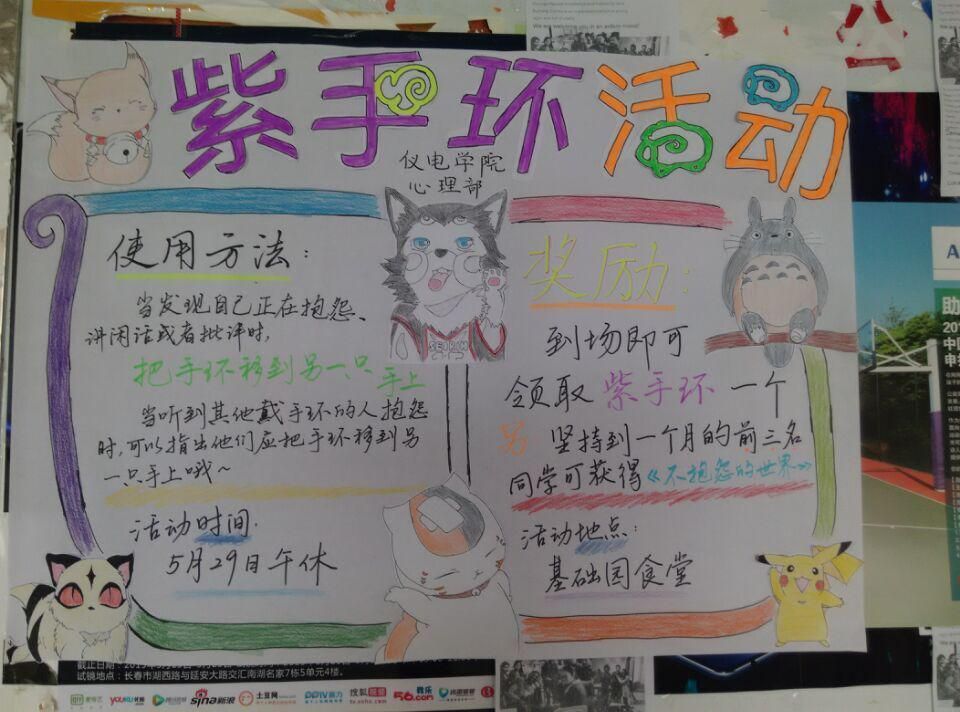 5月27日我院心理部副部及部员在李四光二楼的展板上张贴了关于此次活动的海报,海报上标明了紫手环的使用方法及活动的时间和地点;5月28日课间,活动人员在李四光教学楼中的黑板上写明了紫手环活动的时间、地点、举办学院、具体内容以及奖品情况;28日晚,心理部全体部员进行了走寝宣传,通过一系列的前期宣传工作,让更多同学了解紫手环活动,引起同学们的兴趣。虽然心理部的同学们为了海报的设计绞尽脑汁,为了此次活动的宣传牺牲了课余休息时间,但同学们仍洋溢着幸福的笑容,丝毫没有抱怨和疲惫。