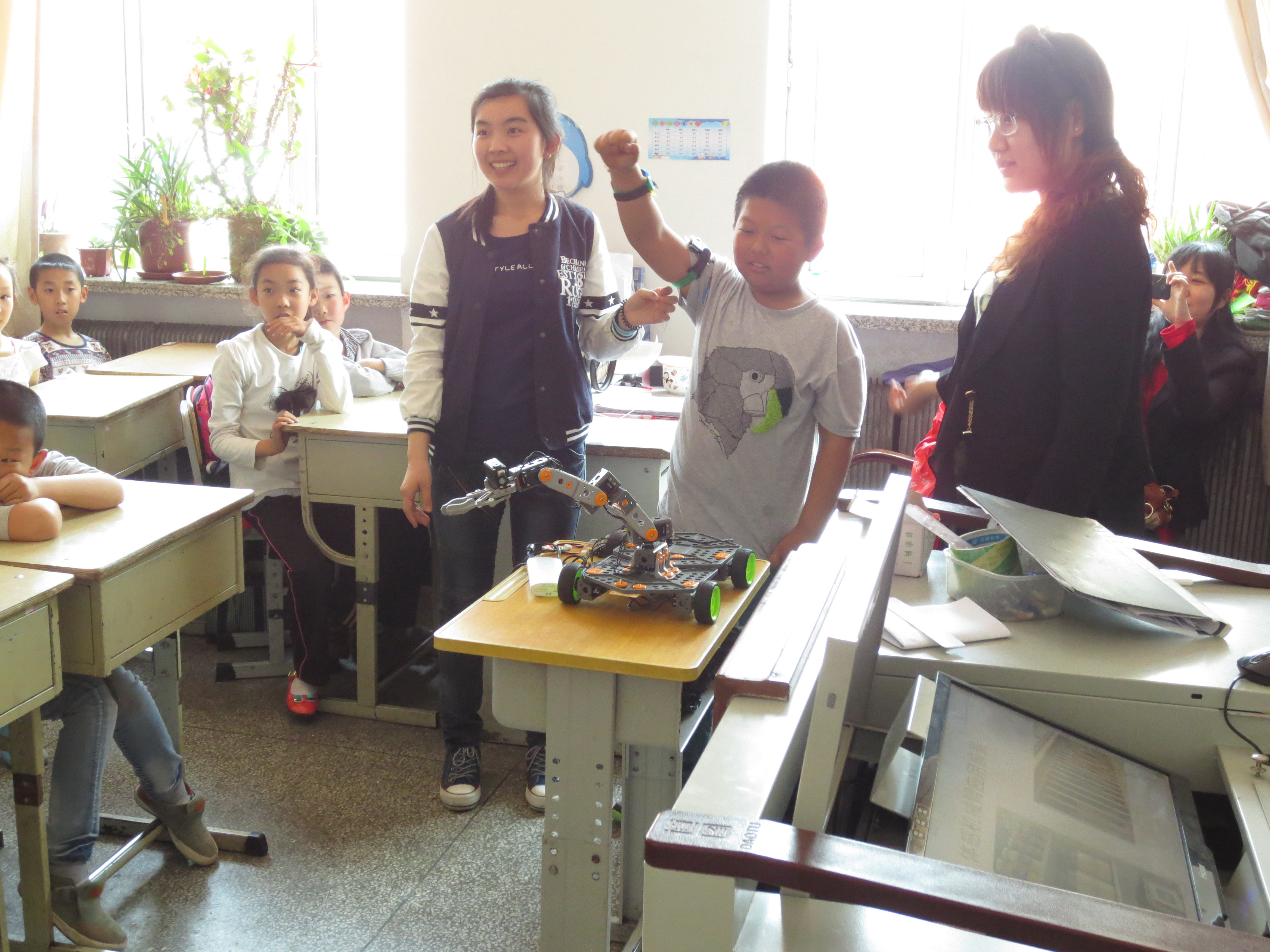 在此次科普讲座的过程中,我院电子科技协会的志愿者首先为安达小学的同学们展示了智能飞行器、体感机械手臂、心率测量器等多个电子作品,奇妙的电子作品让孩子们大开眼界。随后,孩子们在志愿者们的指导下尝试了一些简单的电子模块制作,在动手实践中体会到了科学知识带来的无限乐趣。同学们认真聆听、跃跃欲试,从孩子们清澈明亮的眼睛里我们看到了他们对科学知识的渴求和对大学生活的向往。活动结束后,同学们脸上都洋溢着满足的笑容,丝毫没有疲倦和抱怨。这次科技志愿活动虽然持续时间不长,但是每个同学都收获了很多知识。