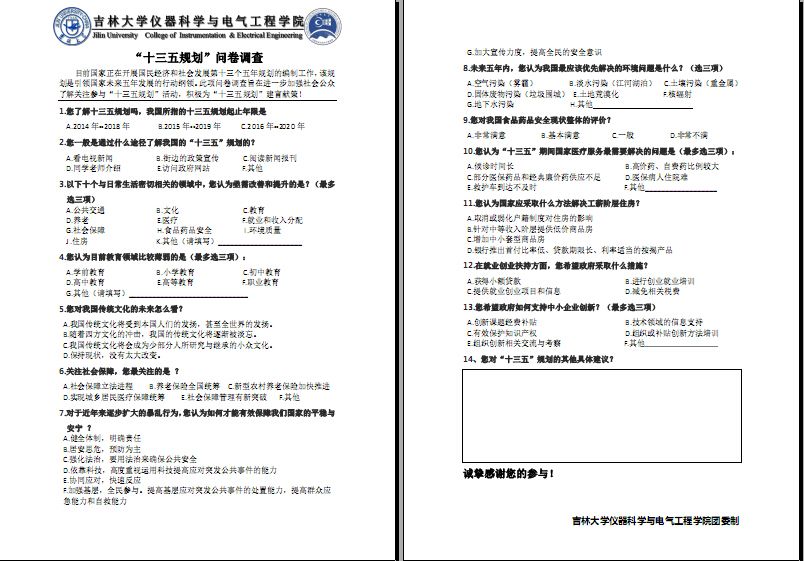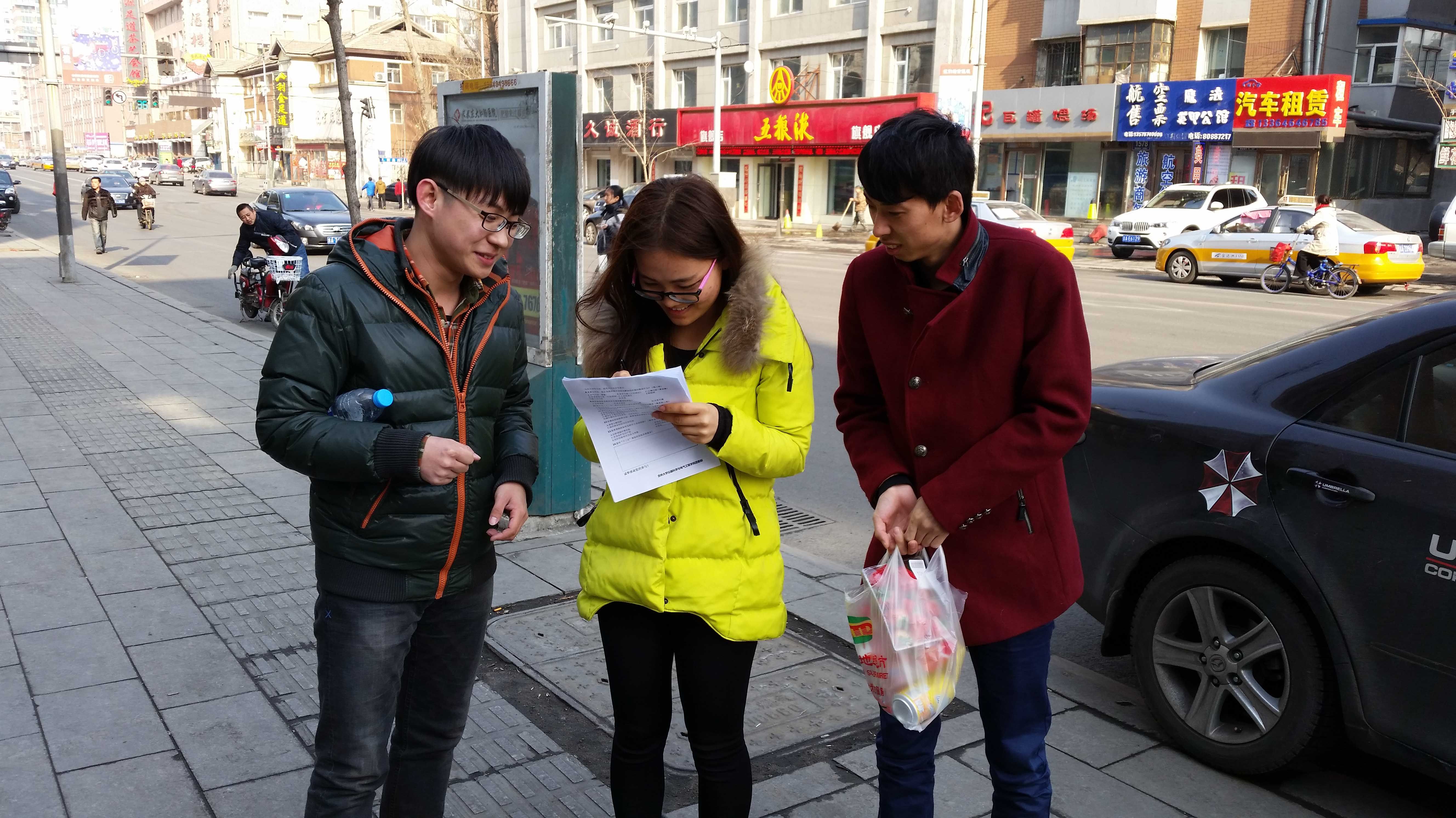 2015年是我国全面深化改革的关键之年,是全面推进依法治国的开局之年,也是全面完成“十二五”规划的收官之年。2015年1月中旬, 我院团委组织成立了“东北振兴发展”大学生社会实践调查团并查阅相关资料,召开前期组织动员活动,并且于1月下旬,完成了最终调研问卷。问卷涉及文化教育、公共交通、医疗卫生、环境质量,住房、养老与社会保障、就业与收入分配等百姓热切关注的焦点问题。此次建言献策调研活动通过实地问卷调研的形式,得到基层群众关于十三五规划的期望与意见,并以此作为第一手资料,形成有内容、有层次、有逻辑的调研报告。按照调研进度安排,我院大学生社会实践调研团主要成员于2015年1月25日至27日携带调查问卷数百份,奔赴调研地,先后在长春、九台等地区进行了关于“建言献策‘十三五’”问卷调研活动。虽是严冬酷寒天气,成员们依旧满怀热情,奔走在各个社区、公园以及车站等场所,对基层居民开展了问卷调查。实践团成员热情耐心地向被调查人员说明调查目的,在征得同意后协助他们认真完成调查问卷相关内容并选取有代表性的人员进行简短访问。由于此次调研涉及多个地点,成员们为了提高效率,节约时间,实践团成员分成多个小组奔赴各地。无论是身上的疲惫还是恶劣的天气都没有浇灭同学们的热情,面对每一个调研对象,仍旧充满感激与虔诚。最终,团队圆满完成任务,发放调查问卷350份,回收348份,其中有效问卷达340份。