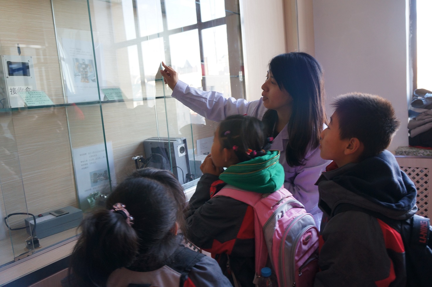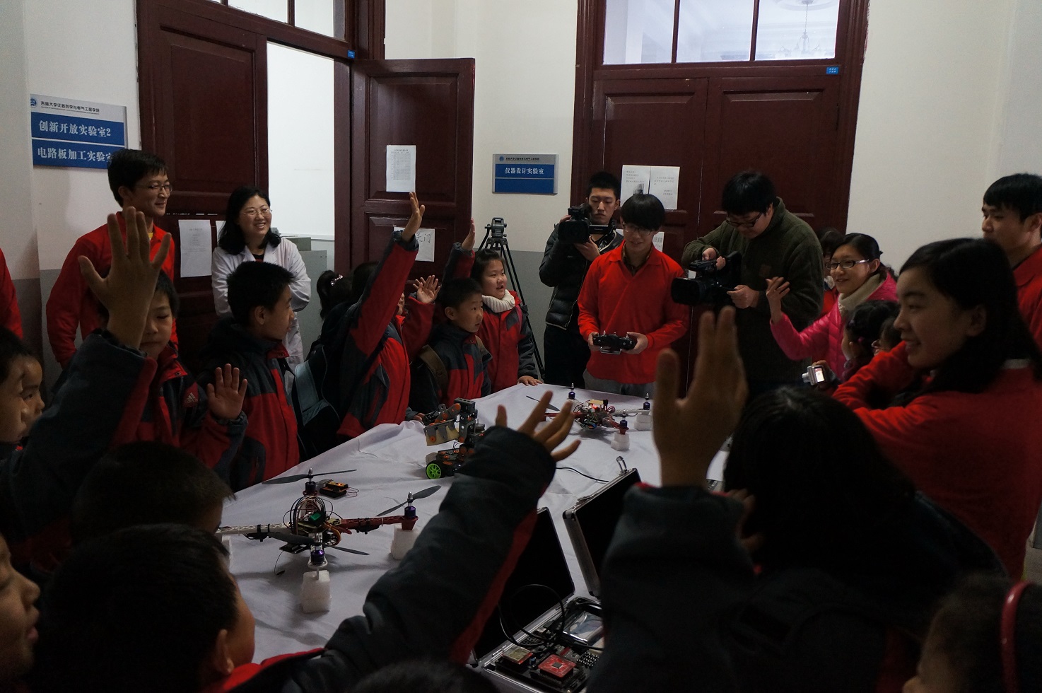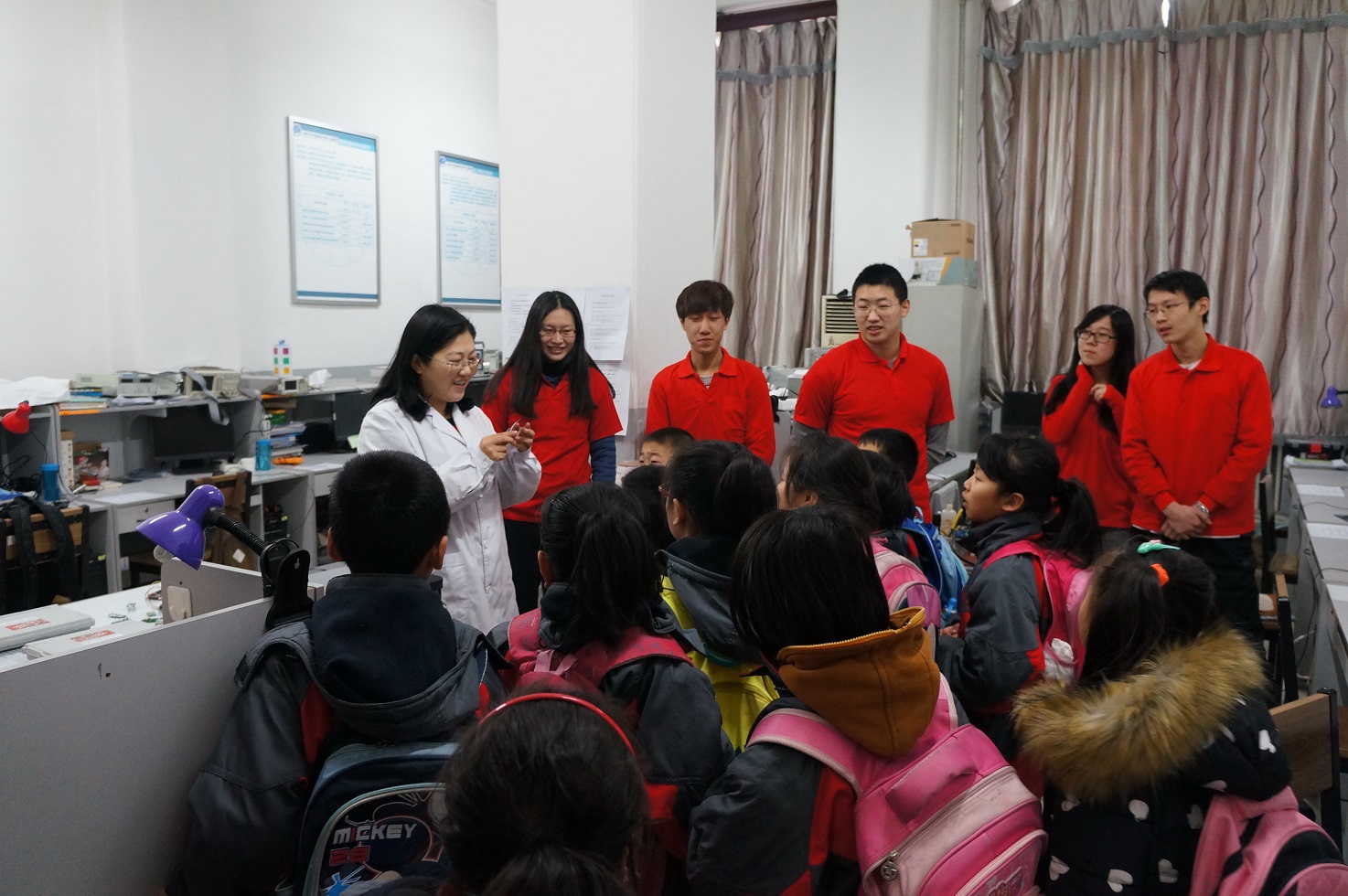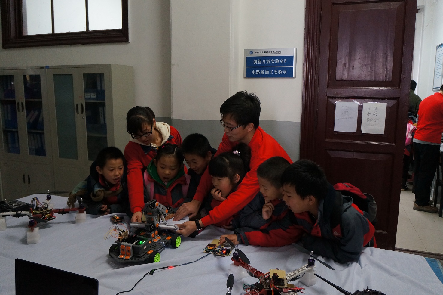 早上8:30,23名小学生乘坐大巴车来到了吉林大学朝阳校区地质宫门前,我院大学生党员志愿者在院团委书记兼本科生党支部书记朱宇、本科生党支部副书记张昊宇及学院主要学生干部的带领下热情地接待了他们,并对孩子们的到来表示热烈欢迎。随后科技参观活动正式开始,孩子们在我院大学生党员志愿者的带领下,首先参观了我院历年大学生电子设计竞赛的优秀作品,奇妙的电子作品让孩子们大开眼界。随后,孩子们在志愿者们的指导和带领下尝试了一些简单的电子模块制作,在动手实践中体会到了科学知识带来的无限乐趣。最后,孩子们又来到了我院大学生科技创新开放实验室,实验中心千承辉老师和万云霞老师在这里热情地接待了他们,带领他们参观了各式各样的实验仪器,并亲自为大家进行演示,小朋友们认真聆听、跃跃欲试,从孩子们清澈明亮的眼睛里我们看到了他们对科学知识的渴求和对大学生活的向往。