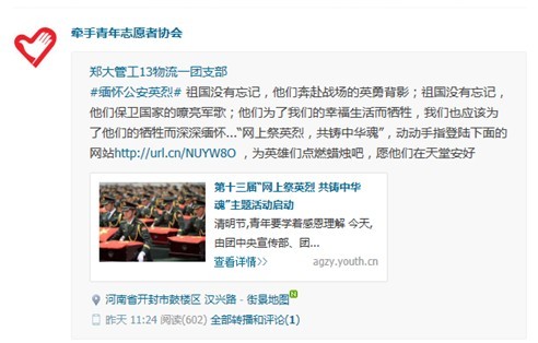 团委、“牵手”青年志愿者协会开展了“微博祭英烈 共铸中华魂”活动,活动通过QQ微博平台进行宣传推广,受到了青年学子的广泛关注,并产生了良好的宣传效果。