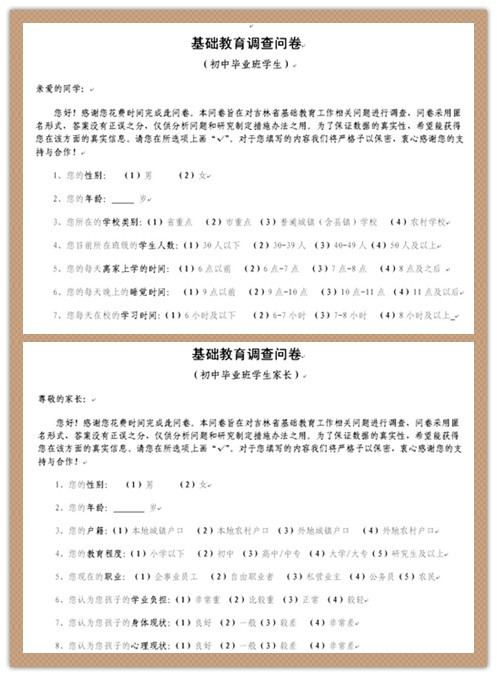 此次专题调研是在吉林省人民政府办公厅信息处组织下开展的,主要针对社会各界关于基础教育特别关切的问题,如择校问题、收费问题、补课问题、学生身体素质问题、学生综合素质问题、教师教学水平问题、中考体制问题等开展专题调研,旨在通过调查研究制定下一步促进全省基础教育均衡发展、科学发展的措施和办法。本次调研工作由吉林省政府办公厅信息处牵头组织,省教育厅、省监察厅、省审计厅、省物价局、省政府发展研究中心、长春市政府办公厅等职能部门配合开展,主要围绕初中毕业班展开。新葡京娱乐场