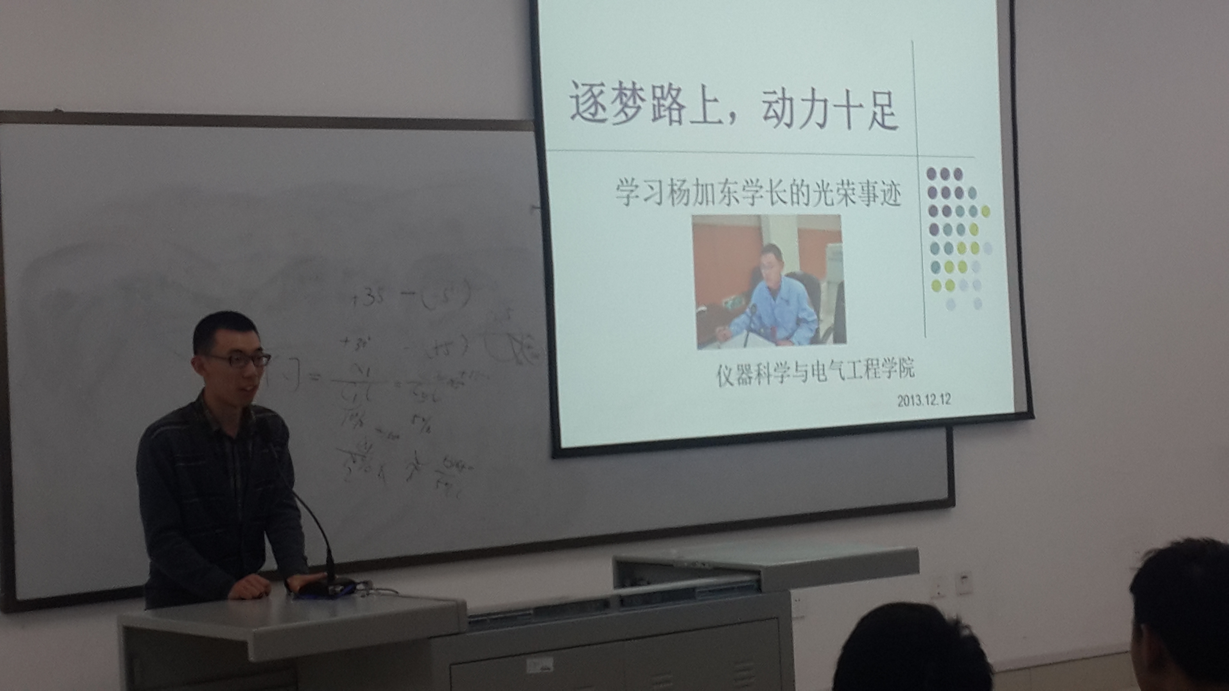 团委于2013年12月12日晚在中心校区李四光实验楼147室组织2013级电气工程及其自动化专业全体学生对吉大校友杨加东先进事迹进行学习,体会专业责任,探讨人生价值。此次活动由学生会秘书部及学习部联合举办,院团委副书记兼2012级辅导员蔡印老师及学生会相关学生干部参加了报告会。