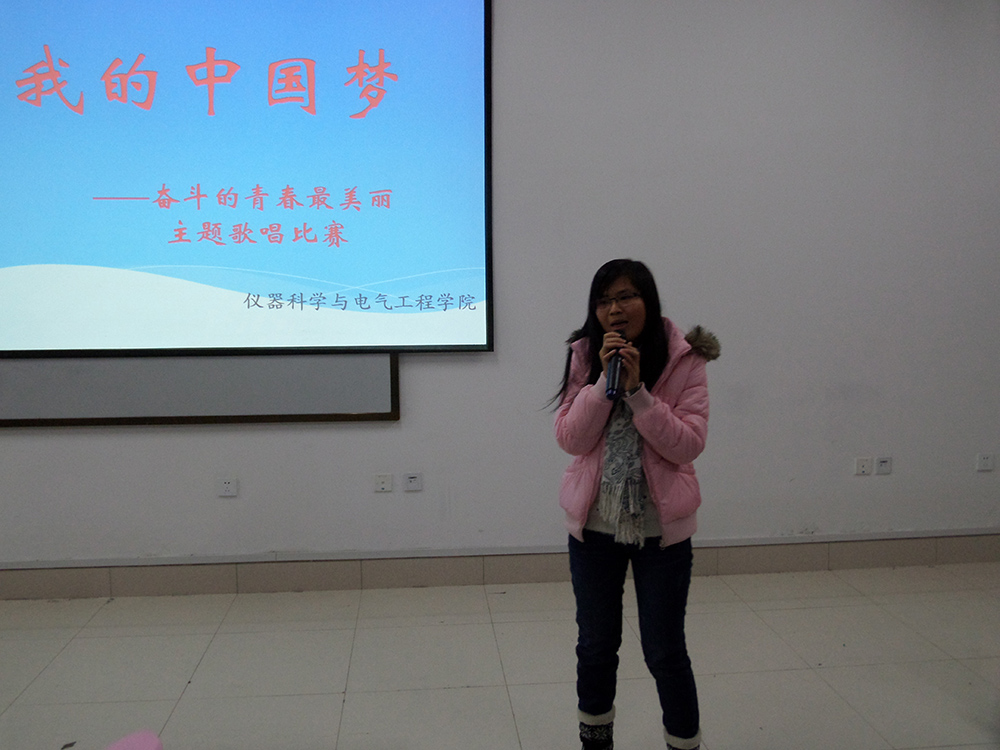 当天18:00,主持人宣布比赛正式开始,全场掌声雷动。首先,651101班团支部崔贞淑同学出场,她以一首《爱要坦荡荡》瞬间点燃全场激情,欢快的节奏,起伏的音调,带领每位同学徜徉在青春中最美的情感里。大一的学妹实力雄厚,学长学姐们自然也不甘示弱,先是2012级陈佳宜同学以其独特的嗓音献唱一首《最初的梦想》,紧扣主题、发人深省;随后,2012级才凯龙同学更是用难度极高的一首《as long as you love me》征服全场观众,把整场比赛推向高潮。当一切音符停止跳动,当大家还沉浸于刚才的喧嚣,董子健同学缓缓地把所有人的目光汇聚在他的身上,一首《童话》,曾经那个年代里令无数少年为之疯狂的抒情神曲,曾经那首脍炙人口的爱情誓言,在如今的大学校园响起,被新一代青年唱响,看似爱情,实则升华为对人生、对祖国的浓烈感情。观众的屏息倾听后是震耳欲聋的掌声。接下来,别具特色的嗓音为全场呈现别样精彩,同时把比赛带入尾声。任伟同学的一首《草原上升起不落的太阳》,空旷的草原上有人放声高歌,歌颂的是英明的领导,更是美好的生活,赞扬着“中国梦”,传承着“中国梦”,更激励着广大青年学子不断奋斗去实现伟大“中国梦”!