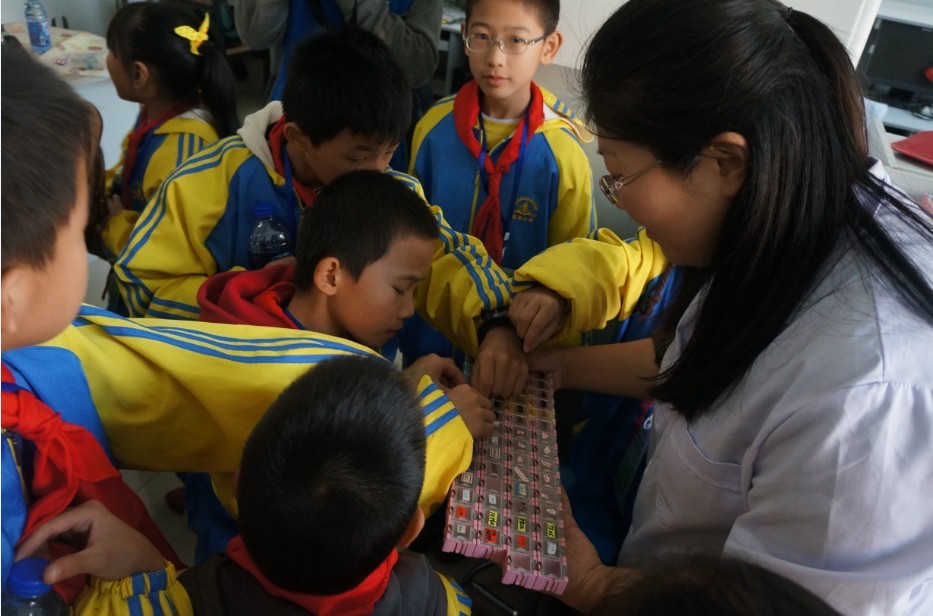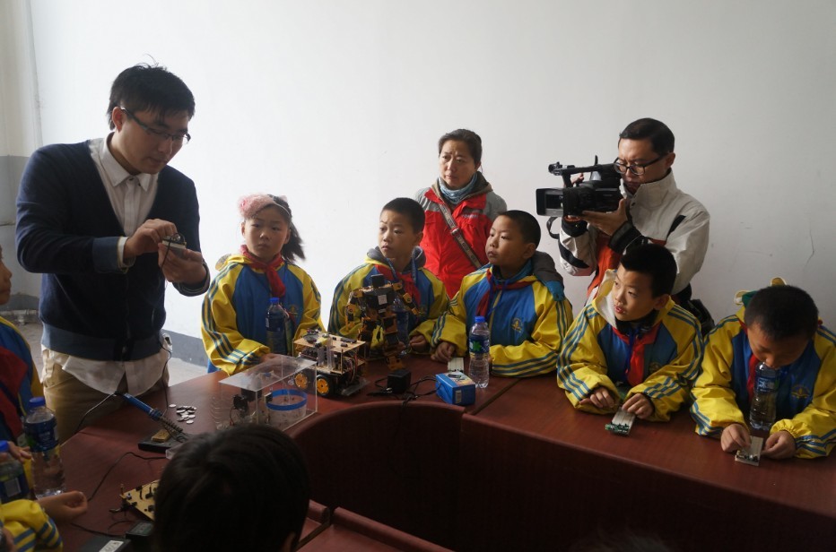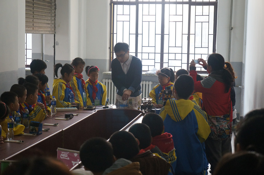 的志愿者们热情地接待了他们,并对同学们的到来表示热烈地欢迎,大家集体在科技之星广场合影留念。随后科技参观活动正式开始,来自西安小学的孩子们在我院大学生科技协会志愿者的带领下,首先参观了我院历年大学生电子设计竞赛的优秀作品,奇妙的电子作品让孩子们大开眼界。随后,孩子们在志愿者们的指导和带领下尝试了一些简单的电子模块制作,在动手实践中体会到了科学知识带来的无限乐趣。最后,孩子们又来到了我院大学生科技创新开放实验室,实验中心千承辉老师在这里热情地接待了这些孩子们,带领他们参观了各式各样的实验仪器,并亲自为大家进行演示,同学们认真聆听、跃跃欲试,从孩子们清澈明亮的眼睛里我们看到了他们对科学知识的渴求和对大学生活的向往。