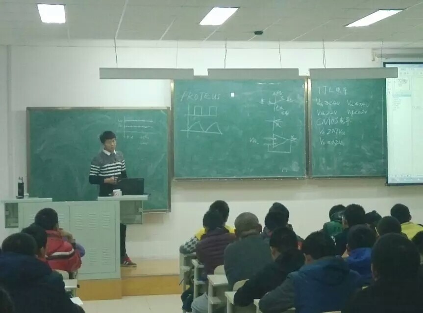 此次培训内容为红外报警灯电路和呼吸灯电路的原理剖析。培训期间主讲人使用proteus软件模拟操作电路,为同学们直观而清晰地展示了两个电路的实际效果,极大激发了同学们的学习热情。除详尽的理论知识讲解外,主讲人不时向新生们进行拓展性提问,与同学们亲密互动,和同学们一起探索电路设计问题,使同学们对理论与实践的结合有了更多更丰富的想法。最后,主讲人细心地解决同学们对理论知识和先前焊接的电路问题,使每一名同学都从中收获了经验和知识。