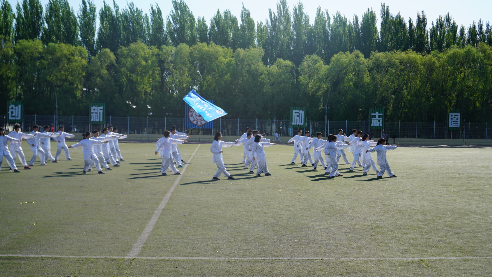 比赛正式开始前,主持人宣读了比赛评分标准并介绍了到场的各位老师和裁判员。我院为第二组单独出场展示,随着响亮口号声的响起,我院的太极方队踏着整齐的步伐进入场地,参赛由一名领队、一名旗手和30人方队组成,另外还有四名替补队员。比赛中每一个人的努力都值得被肯定。在轻松而舒缓的音乐中,同学们柔中带刚,动作娴熟到位,张弛有度,充盈着太极之美。即使天气炎热,同学们为学院增光添彩的热情也无法被阻挡,身着白色太极服的他们在赛场上格外出彩。